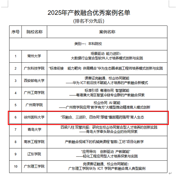 近日,工业和信息化部人才交流中心正式发布《2025年产教融合优秀案例名单》。我校药学院申报的《“双融合、三进阶、四协同”厚植“懂医精药强用”育人生态》产教融合案例成功入选,成为全国100项优秀案例之一,其中本科院校案例仅24项。此次评选经过各高校自主申报、形式审查、专家评审等多轮严格遴选,该案例的入选体现了我校在深化产教融合、服务区域产业发展方面取得的显著成效,是工信部对我校产教融合工作的高度认可。