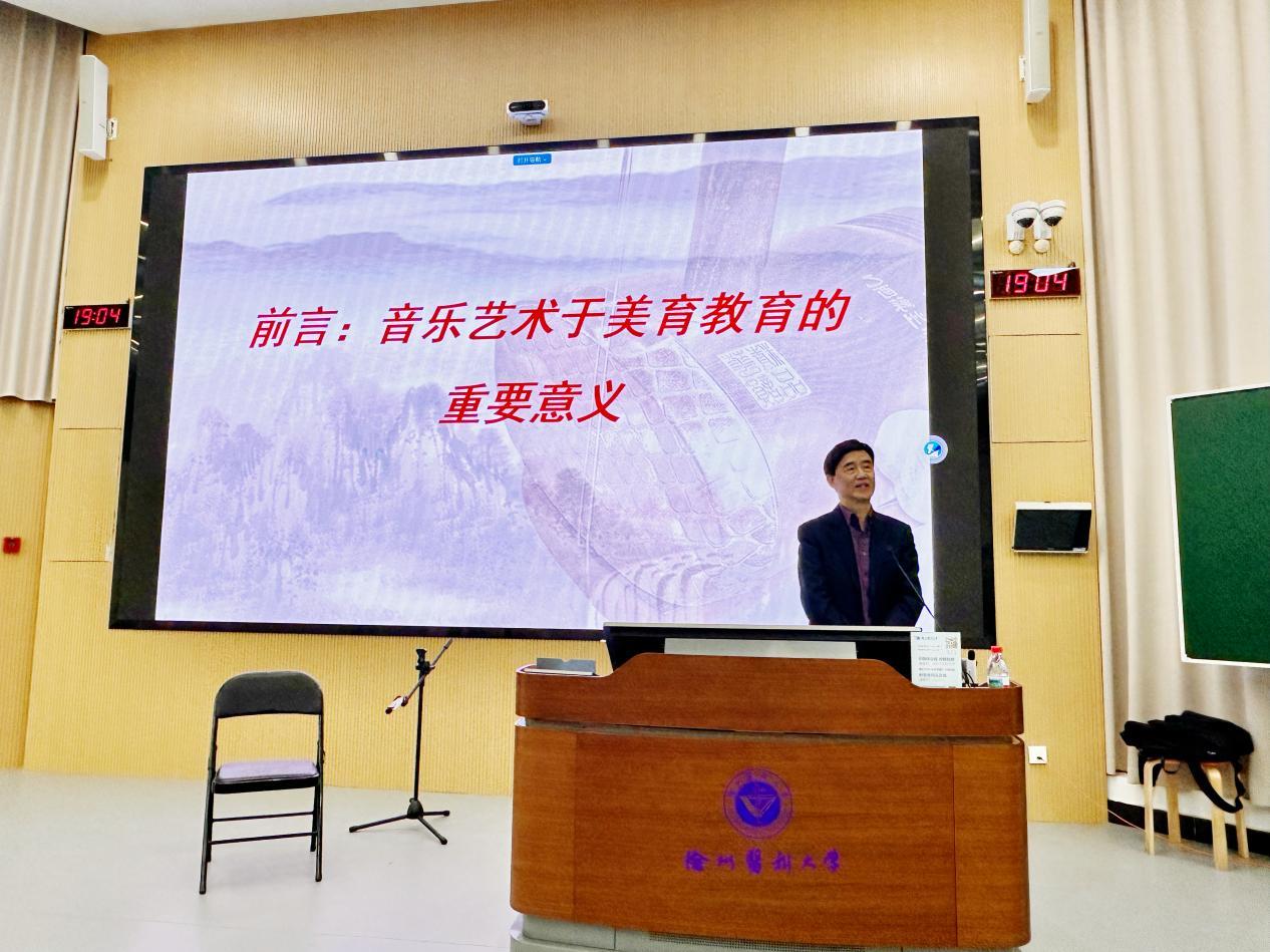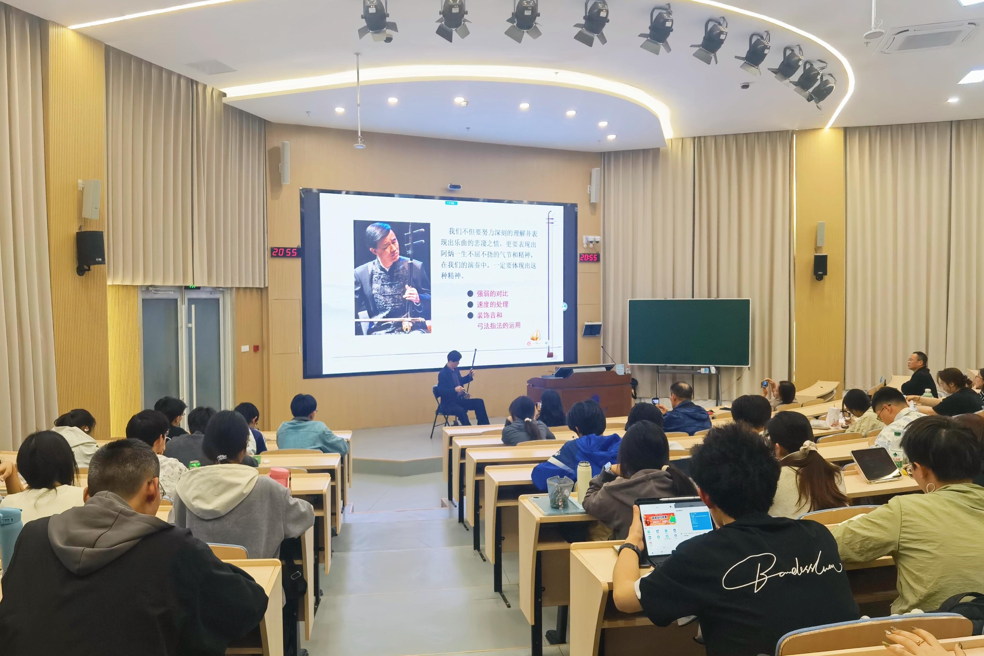 当晚的重头戏聚焦二胡艺术。朱昌耀先生梳理二胡的悠久历史,讲述刘天华、阿炳两位江苏籍二胡大师的艺术成就,并亲自登台演奏四首曲目——《二泉映月》哀婉深沉,《良宵》轻快明朗,《江南春色与扬州小调》温婉灵动,《赛马》激昂奔放,精湛技艺赢得现场师生阵阵热烈掌声。讲座尾声,朱昌耀先生寄语徐医学子,期望同学们深耕文化根脉,为中华优秀民族音乐的传承、创新与发展贡献力量。